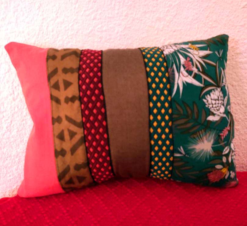 Coussin en patchwork de wax et cotons traditionnels. 40x28cm, 0,9kg, 35€+port.possibilité de confectionner un coussin ensemble dans les tons souhaités